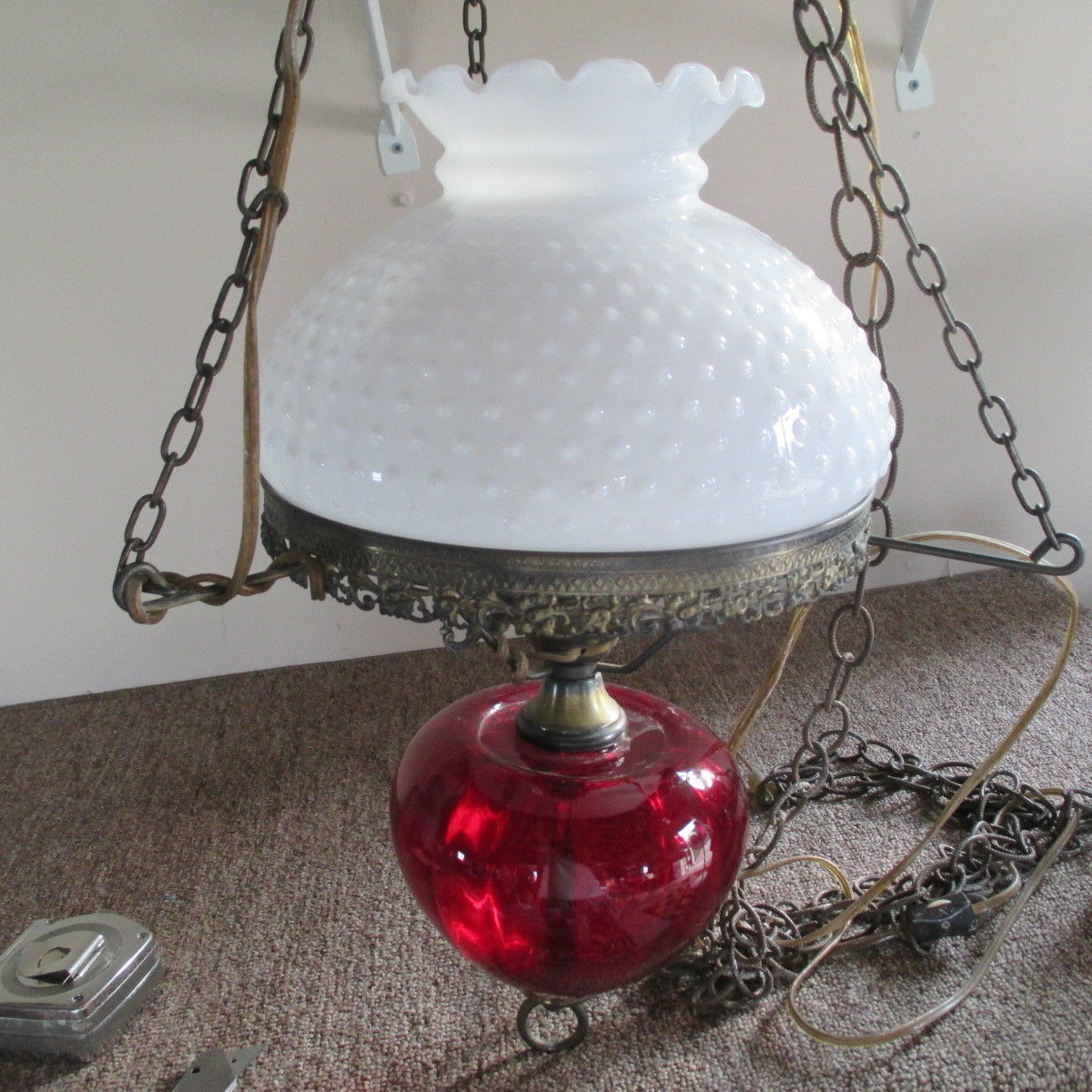 Title (ebay affiliate link): Vintage Hanging Swag Lamp with Milk Glass Shade & Red Glass Bottom