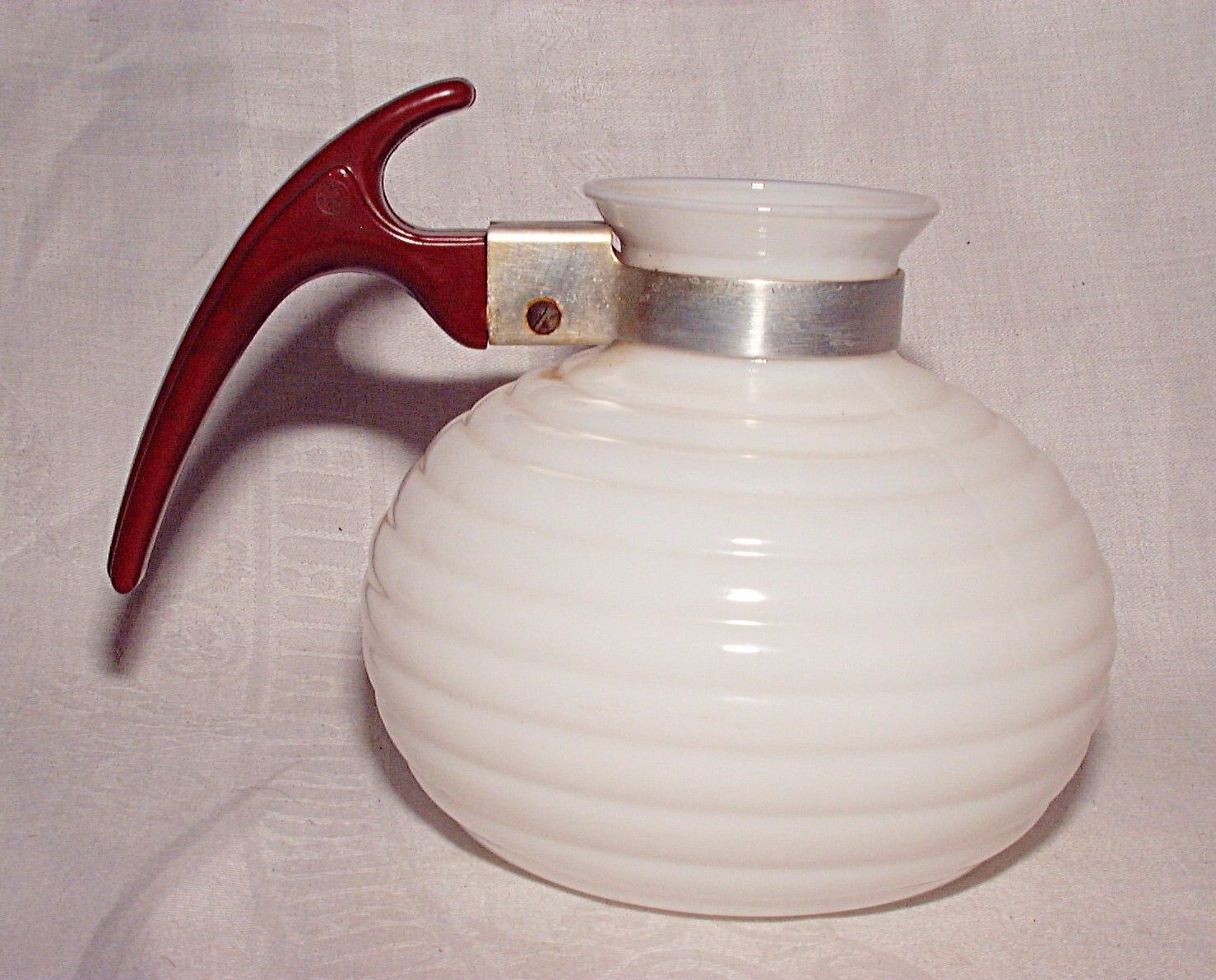 Title (ebay affiliate link): VINTAGE McKEE RIBBED MILK GLASS COFFEE POT wRED CATELIN HANDLE DECO LOOK
