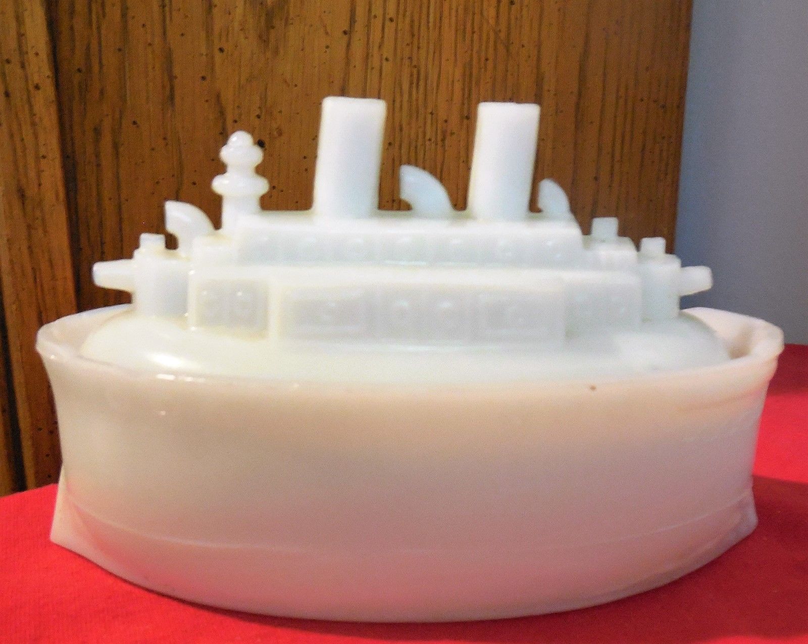 MILK GLASS BATTLESHIP MUSTARD DISH CONTAINER
