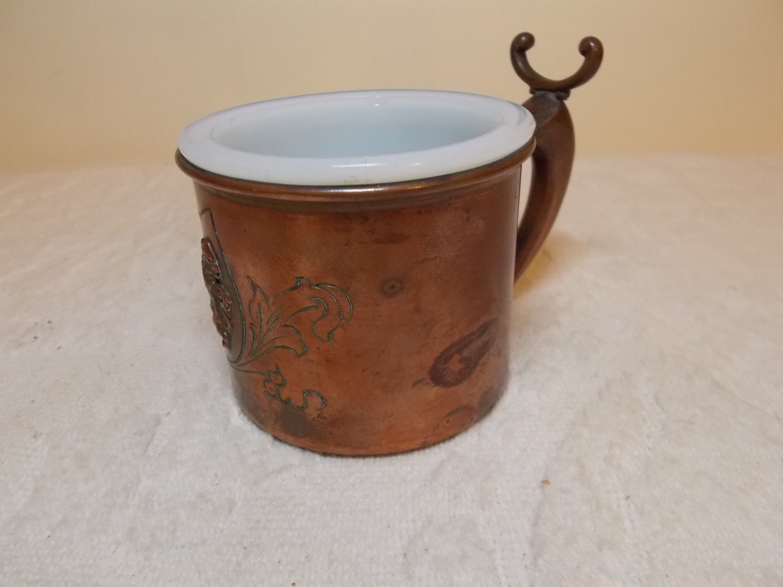 Vintage Heraldic Bronze Metal Shaving Mug with Milk Glass Cup Liner