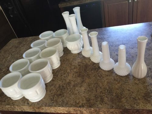 Title (ebay affiliate link): Lot of 19 White Milk Glass Planter/vase Wedding Florist Cleveland Randall Brody