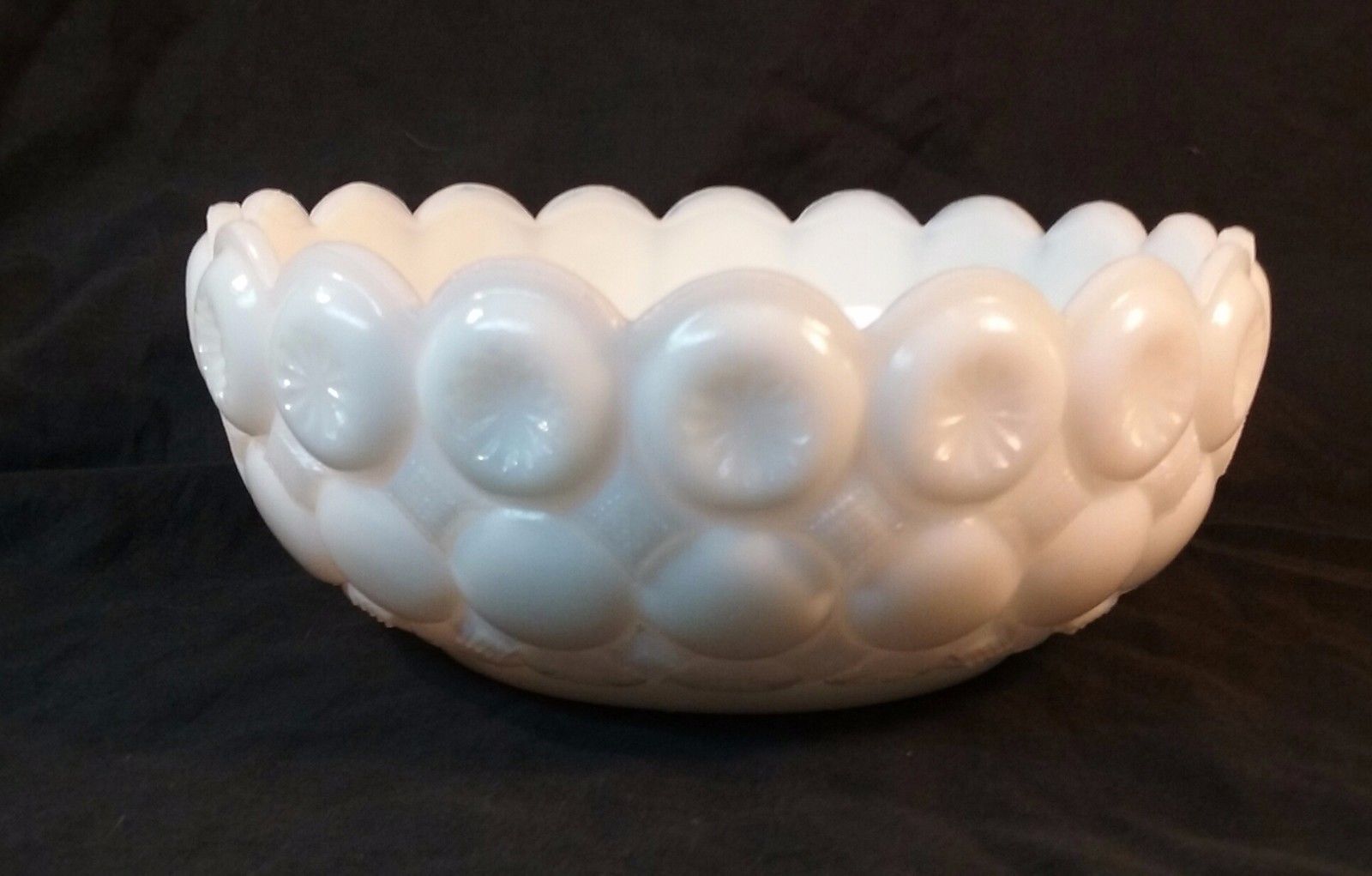 Title (ebay affiliate link): 3 1/4" x 8" Vintage White Milk Glass Stars Candy Dish With Scalloped Ruffled