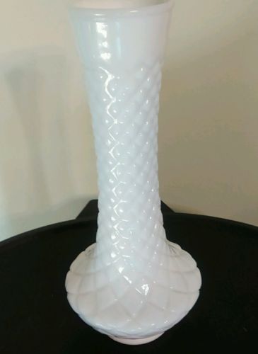 Title (ebay affiliate link): Randall 9" White Milk Glass Bud/ Bridal Vase With Diamond Cut Mint Condition