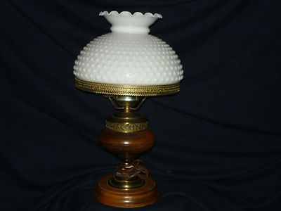 Vintage Wooden Lamp with Hobnail White Milkglass Shade