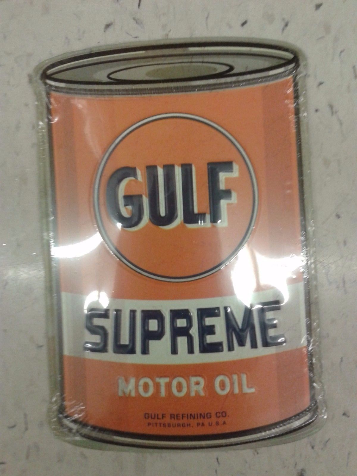 GULF SUPREME MOTOR OIL METAL SIGN VINTAGE LOOK 8 BY 5.5 INCHES RAISED LETTERS