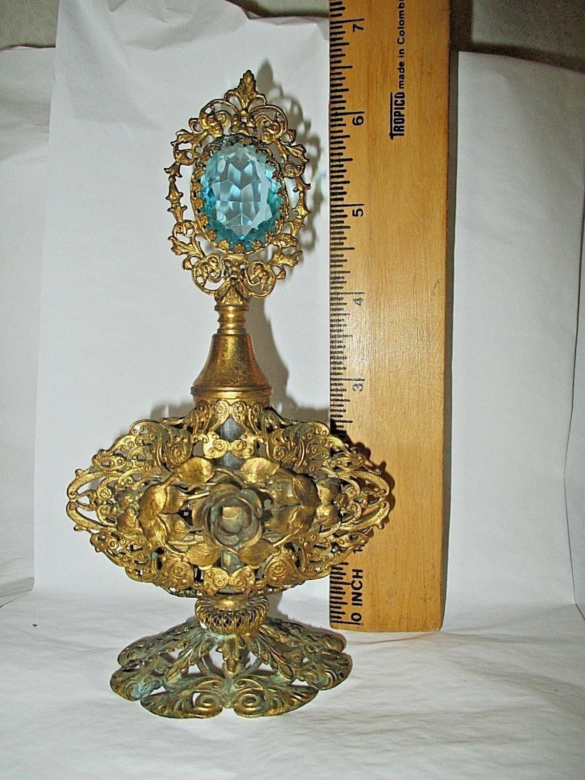 Title (ebay affiliate link): Antique Victorian Gold Filigree Perfume Bottle With Large Blue Glass Stone