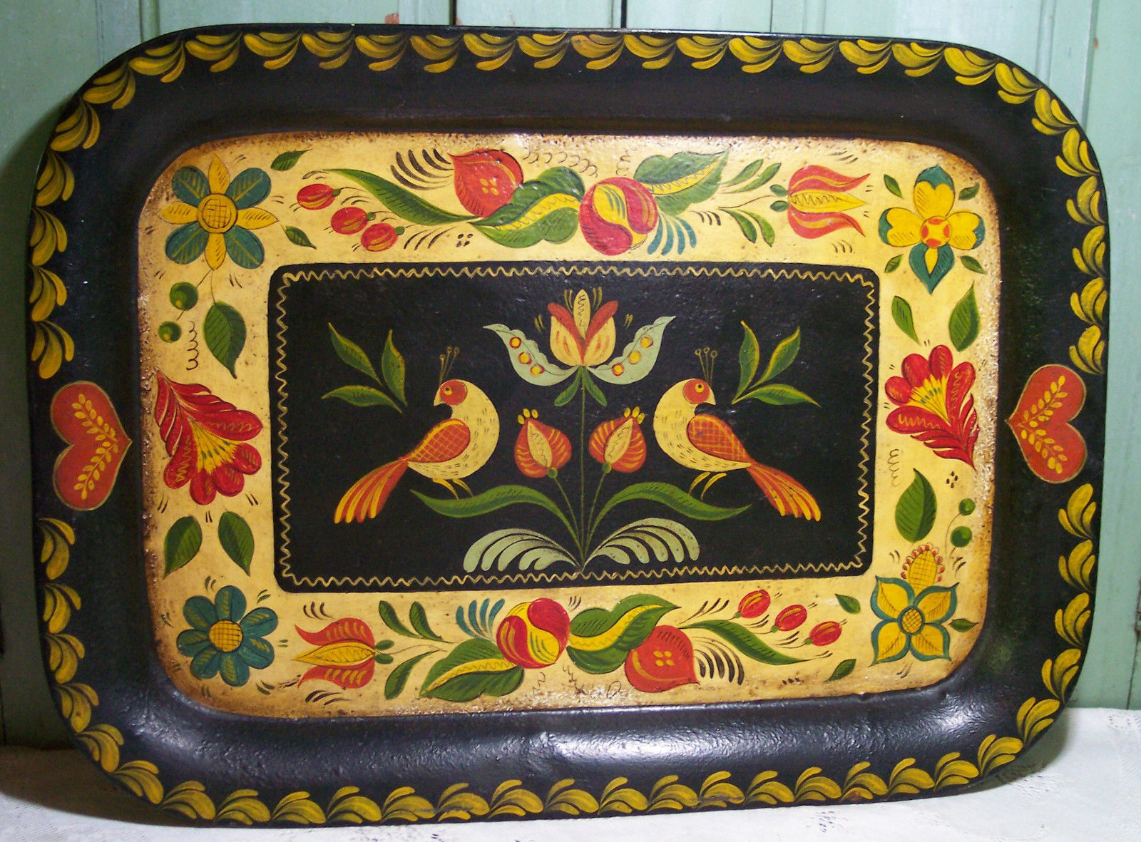 vintage pa folk art distelfink floral bird Redcay painted toleware metal tray