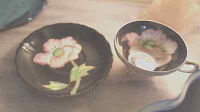Title (ebay affiliate link): Vintage Opalescent Black - Pink Flower Hand Painted 3 Footed Tea Cup and Saucer
