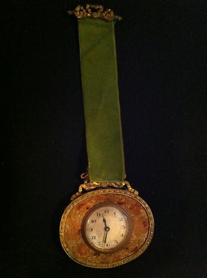antique clock with needlepoint and metal frame frame