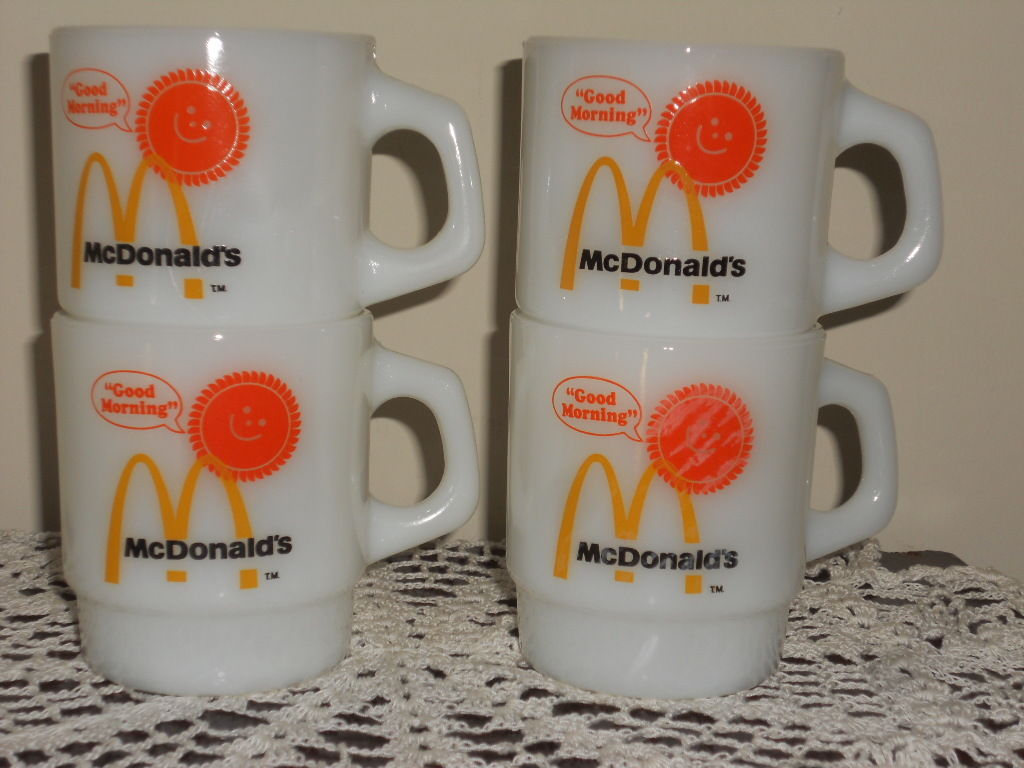 Title (ebay affiliate link): Vintage Anchor Hocking FIRE KING Mcdonald's Good Morning Mugs 4 Milk Glass Cups