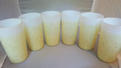 6 vintage Fire-King GLAMALITE milk glass tumblers atomic glitter rubber coating