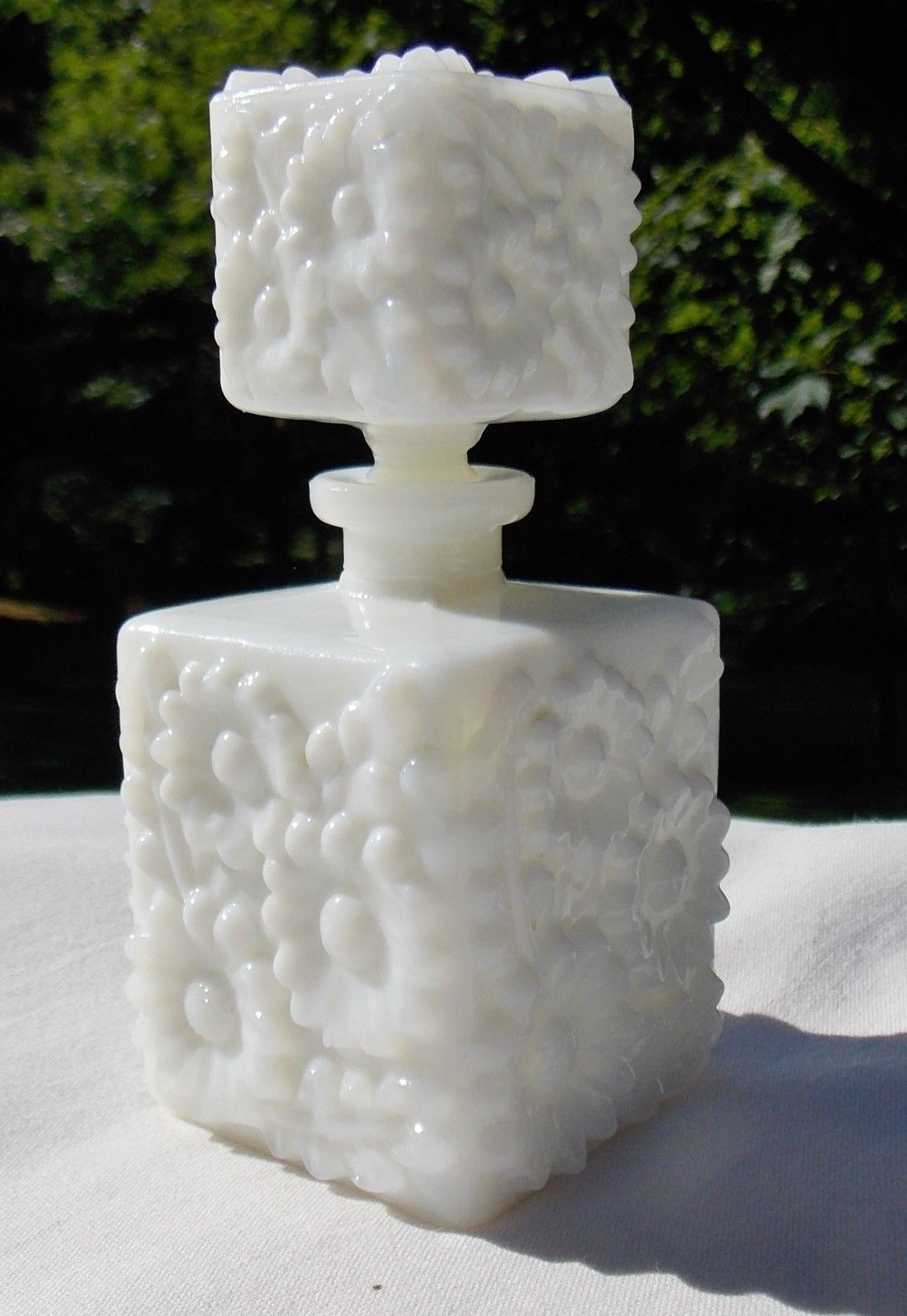 Title (ebay affiliate link): Vintage Irice Floral Milk Glass Perfume Bottle w/ Matching Milk Glass Stopper