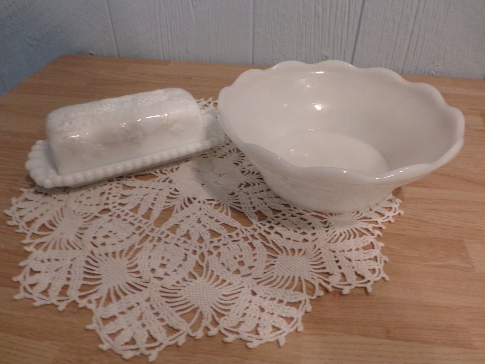 White Milk Glass Bowl and Butter Dish Grape Pattern