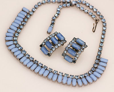 Blue Milk Glass and Rhinestone Necklace and Clip Earrings