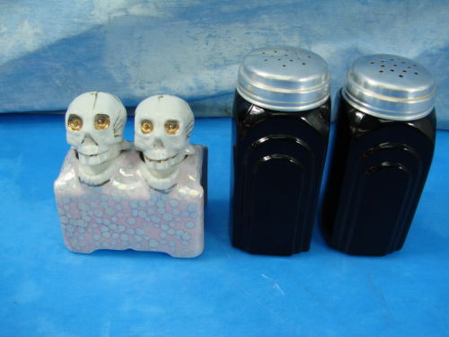 Title (ebay affiliate link): Lot of 2 Vtg Patent T.T. Ceramic Skull Black Milk Glass Salt & Pepper Shakers