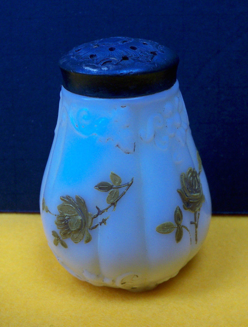 Antique Milk Glass Salt Shaker Rose Pattarn EAPG Unknown Maker