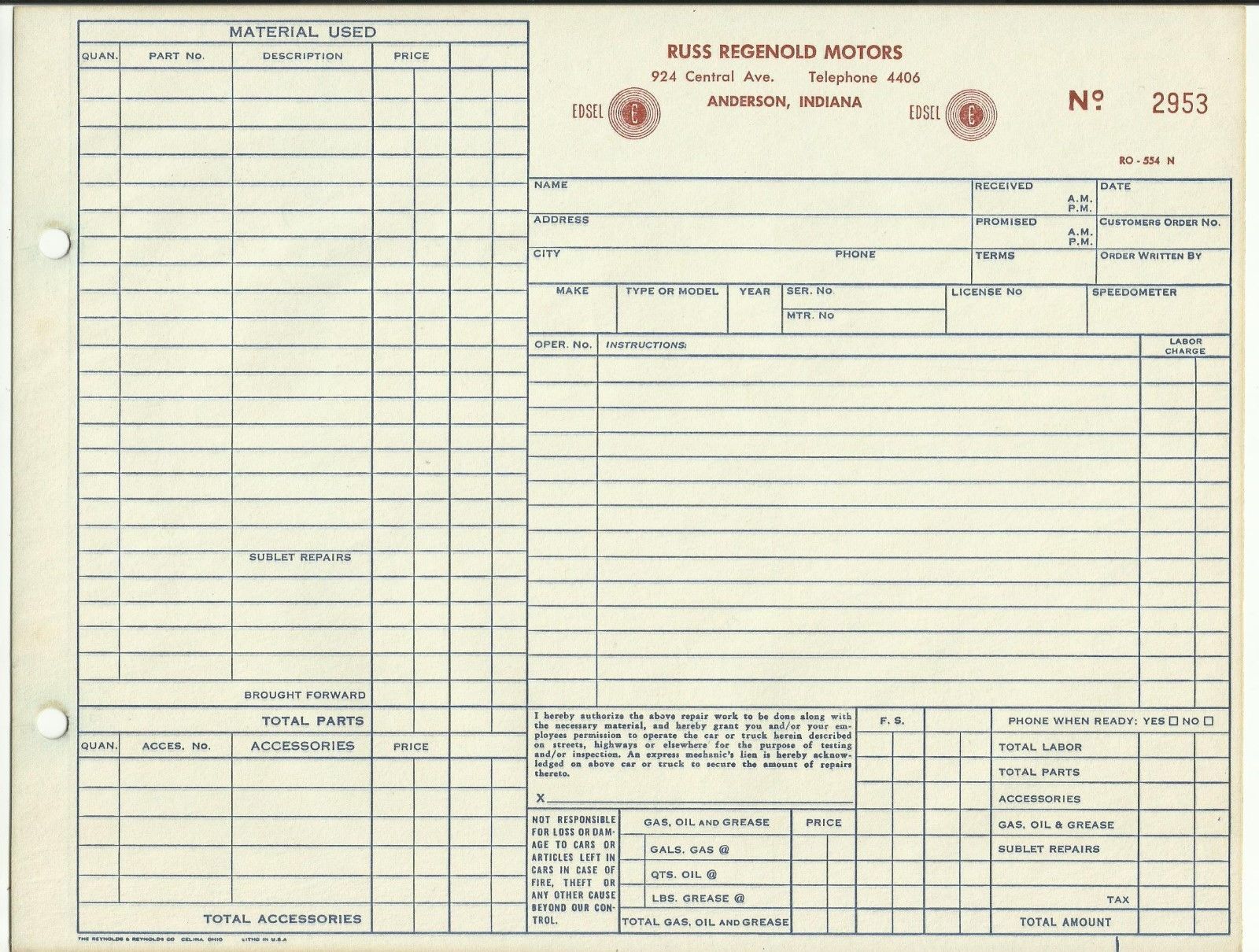 1958 Edsel Dealership Service Repair Blank Work Order Regenold Motors Indiana