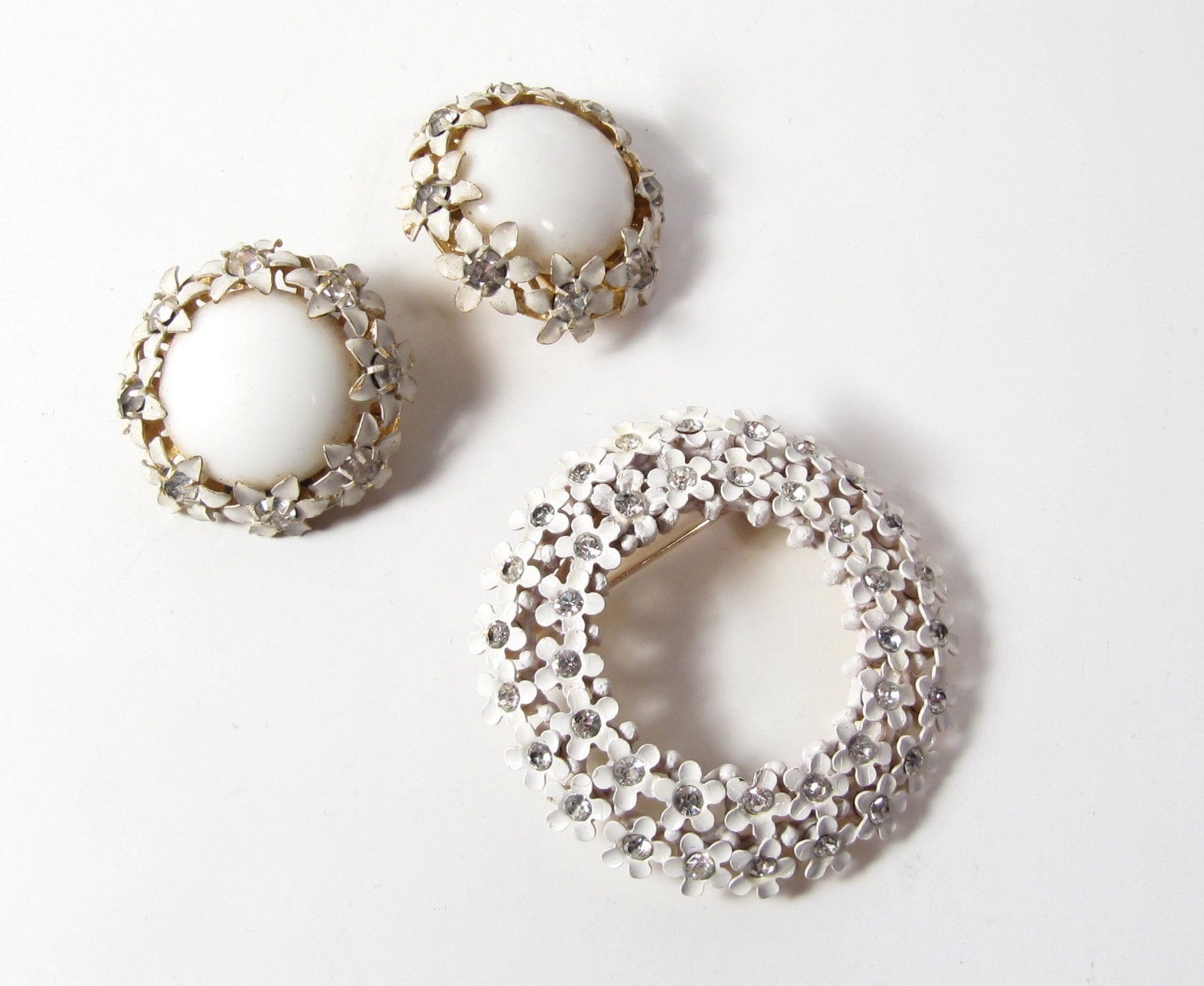 Title (ebay affiliate link): Vintage White Milk Glass Daisy Rhinestone Pin Brooch & Clip On Earrings Set '50s