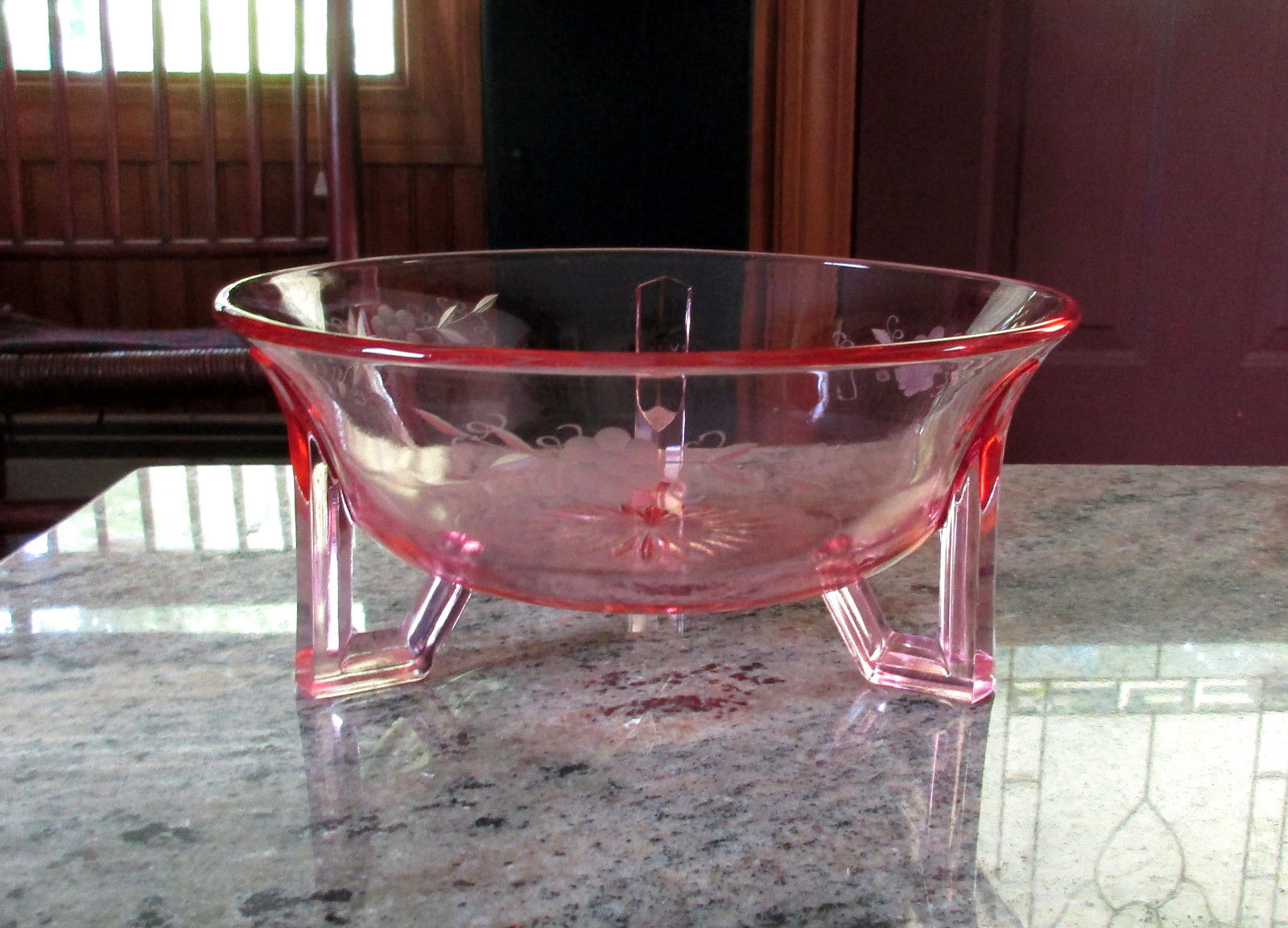 Title (ebay affiliate link): Vintage Pink Depression Glass Floral Etched Three Footed Bowl
