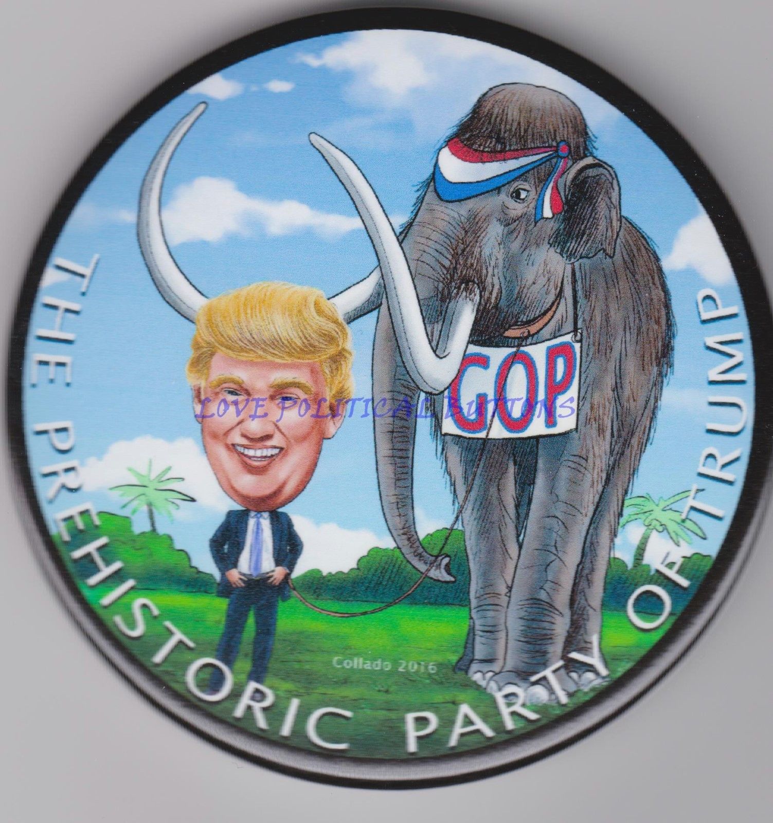 Title (ebay affiliate link): DONALD TRUMP 2016 THE PREHISTORIC PARTY OF TRUMP POLITICAL BUTTON PIN 3 IN