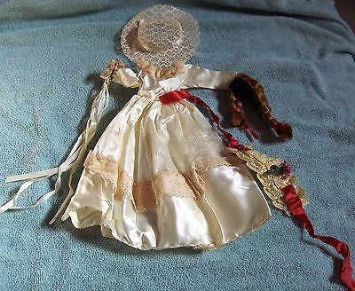 Antique Silk Doll Dress 11", waist band, flowers and wig