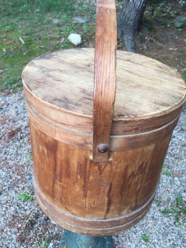 Title (ebay affiliate link): Antique 19thC Early Primitive Shaker Folk Art Firkin Sugar Bucket & Swing Handle