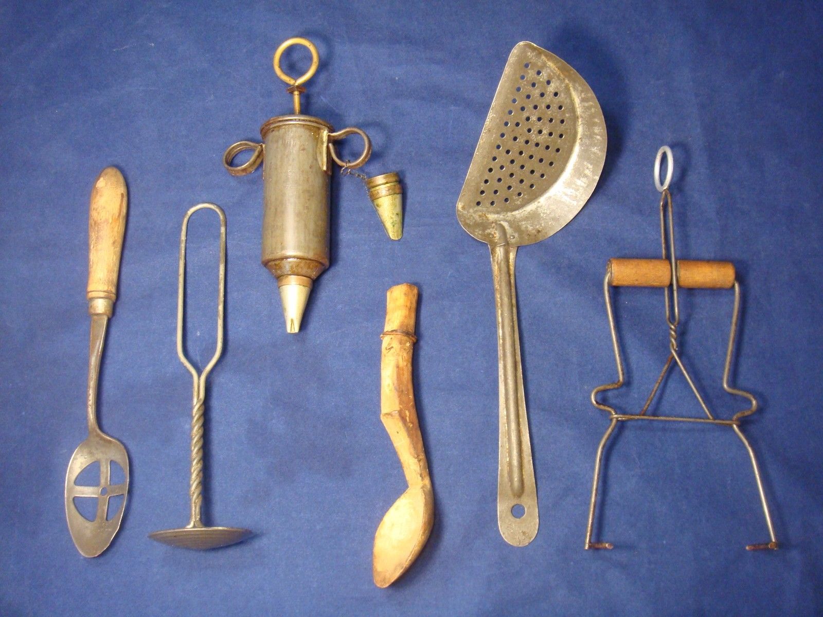 Title (ebay affiliate link): LOT~6 ANTIQUE VINTAGE KITCHEN UTENSILS~COOKIE PRESS~WOODEN SPOON~STRAINER & MORE
