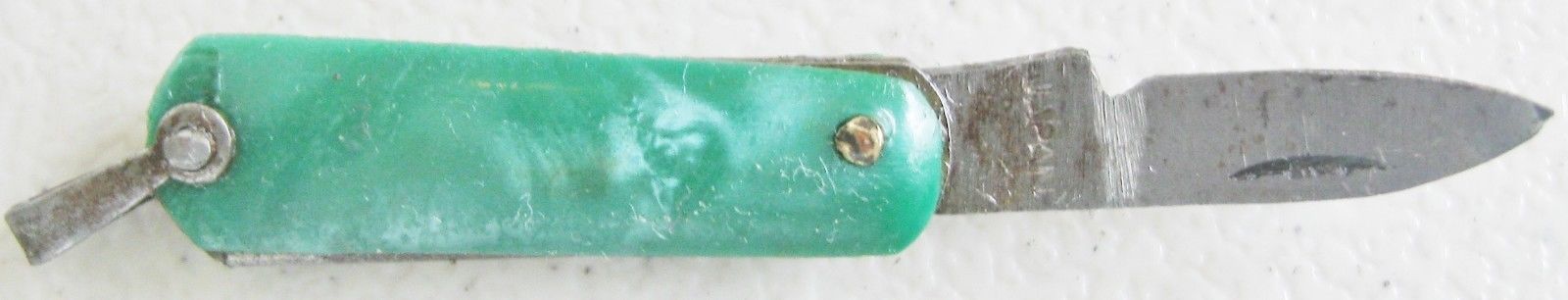 VINTAGE MINIATURE POCKET KNIFE KEYCHAIN LOOP GREEN CELLULOID POCKET WATCH FOB