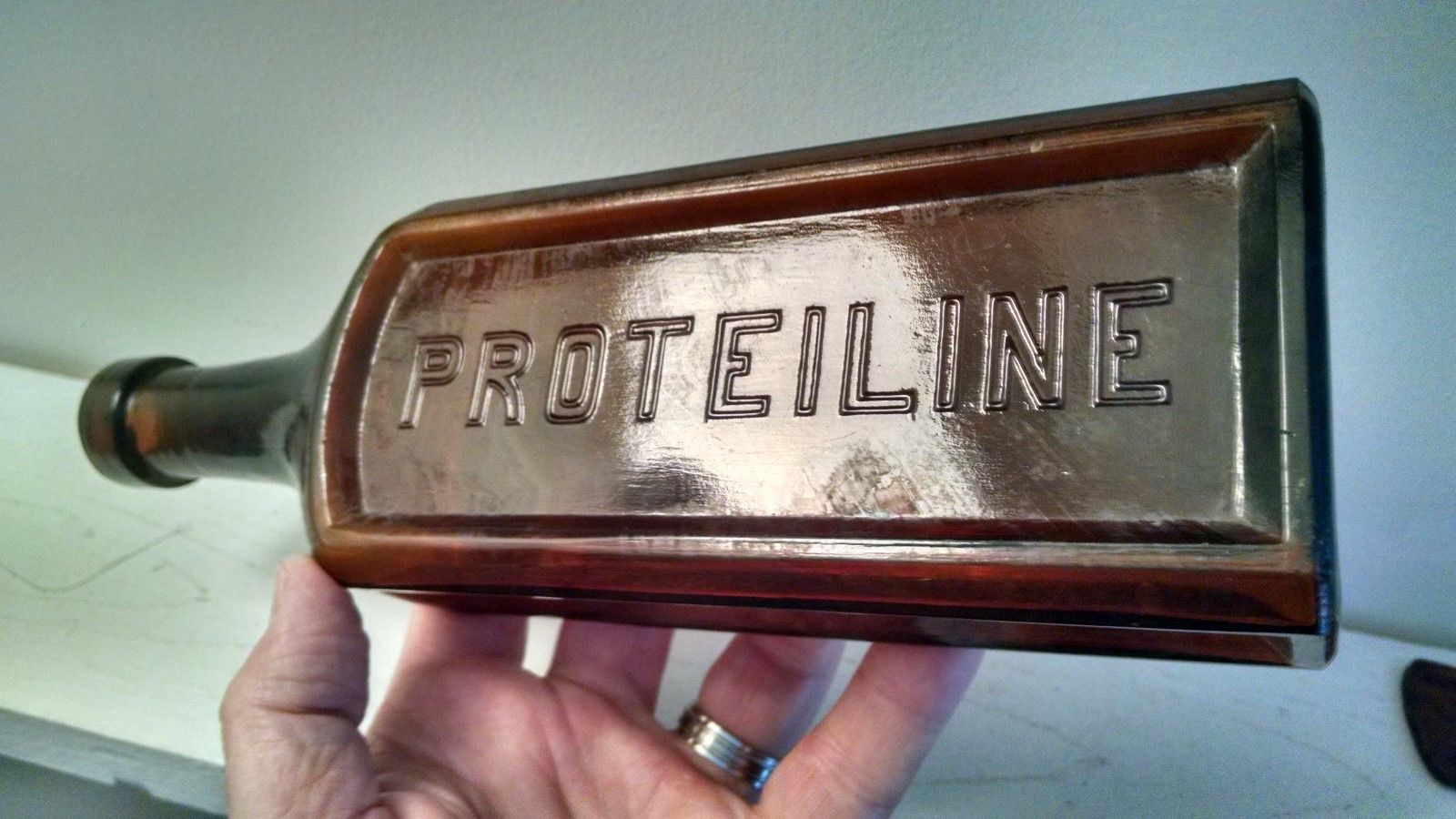 Title (ebay affiliate link): Very Rare Tall Amber Blown Patent Medicine Bottle PROTEILINE On 3 Sides, 9 3/4"