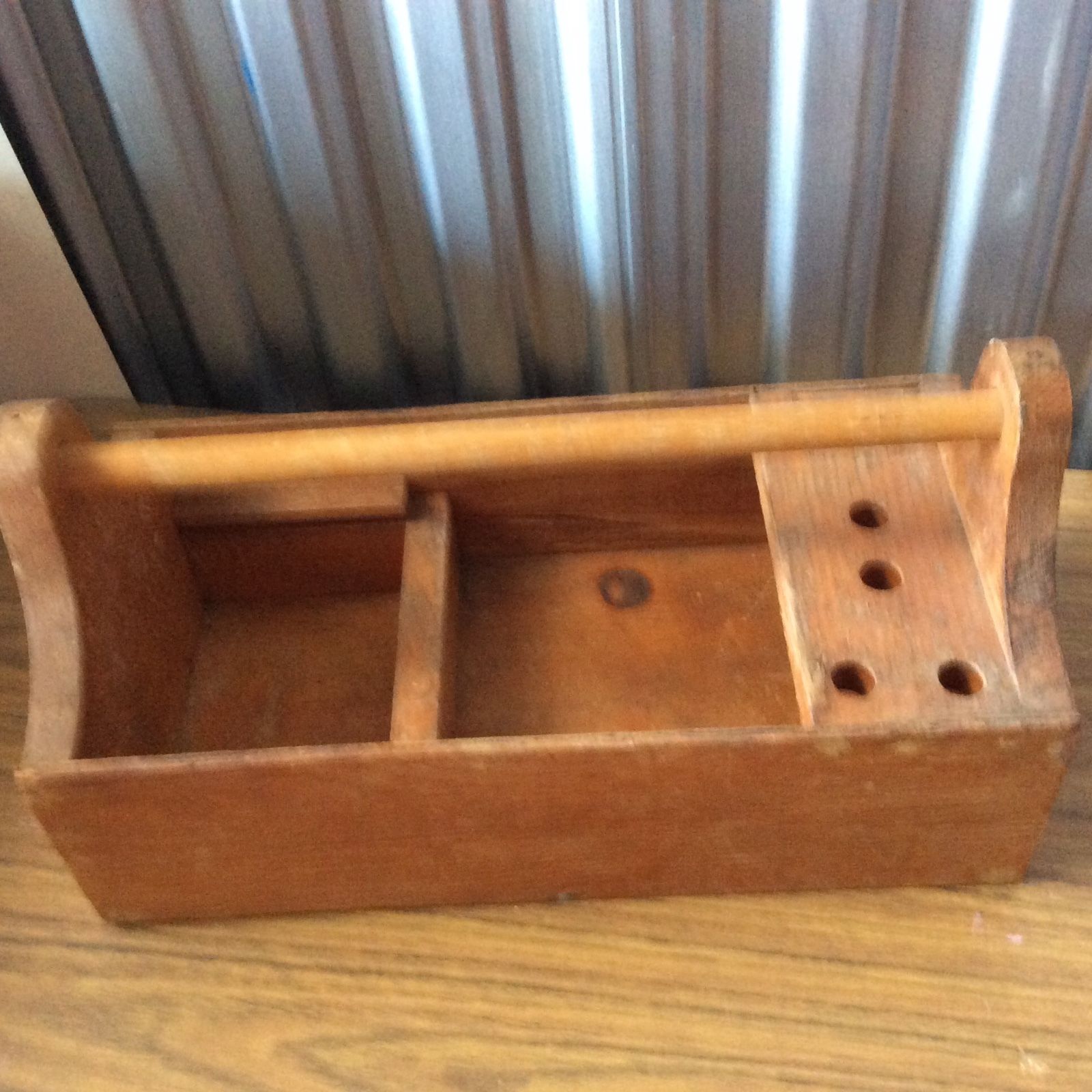Title (ebay affiliate link): VINTAGE PRIMITIVE HANDMADE WOODEN CARPENTER TOOL BOX RUSTIC GARDEN CADDY TOTE