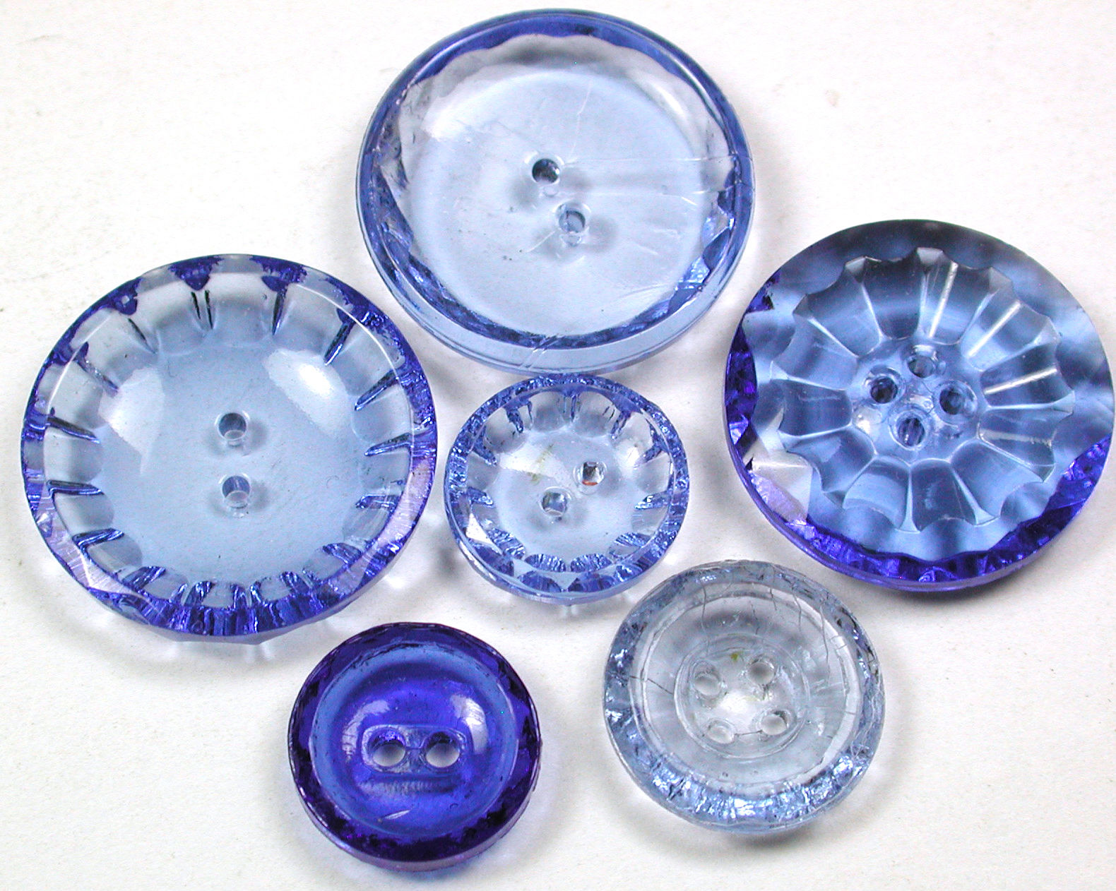 6 Vintage Depression Glass Buttons Pretty Blue Color Designs - 11/16 to 1"