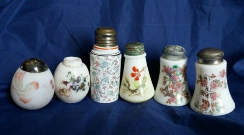 Title (ebay affiliate link): Lot of Six White MIlk Glass Shakers: Mt. Washington, Hand Painted, Creased Neck