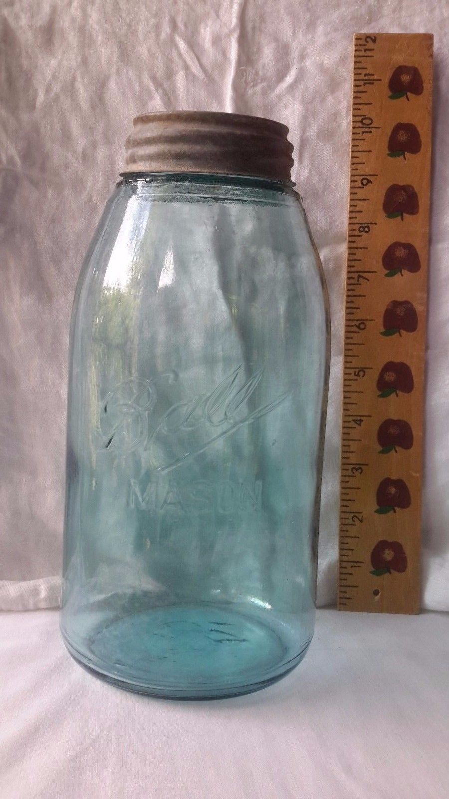 Title (ebay affiliate link): Large Antique Aqua Light Blue Ball Mason Jar triple L with Zinc milk glass Lid