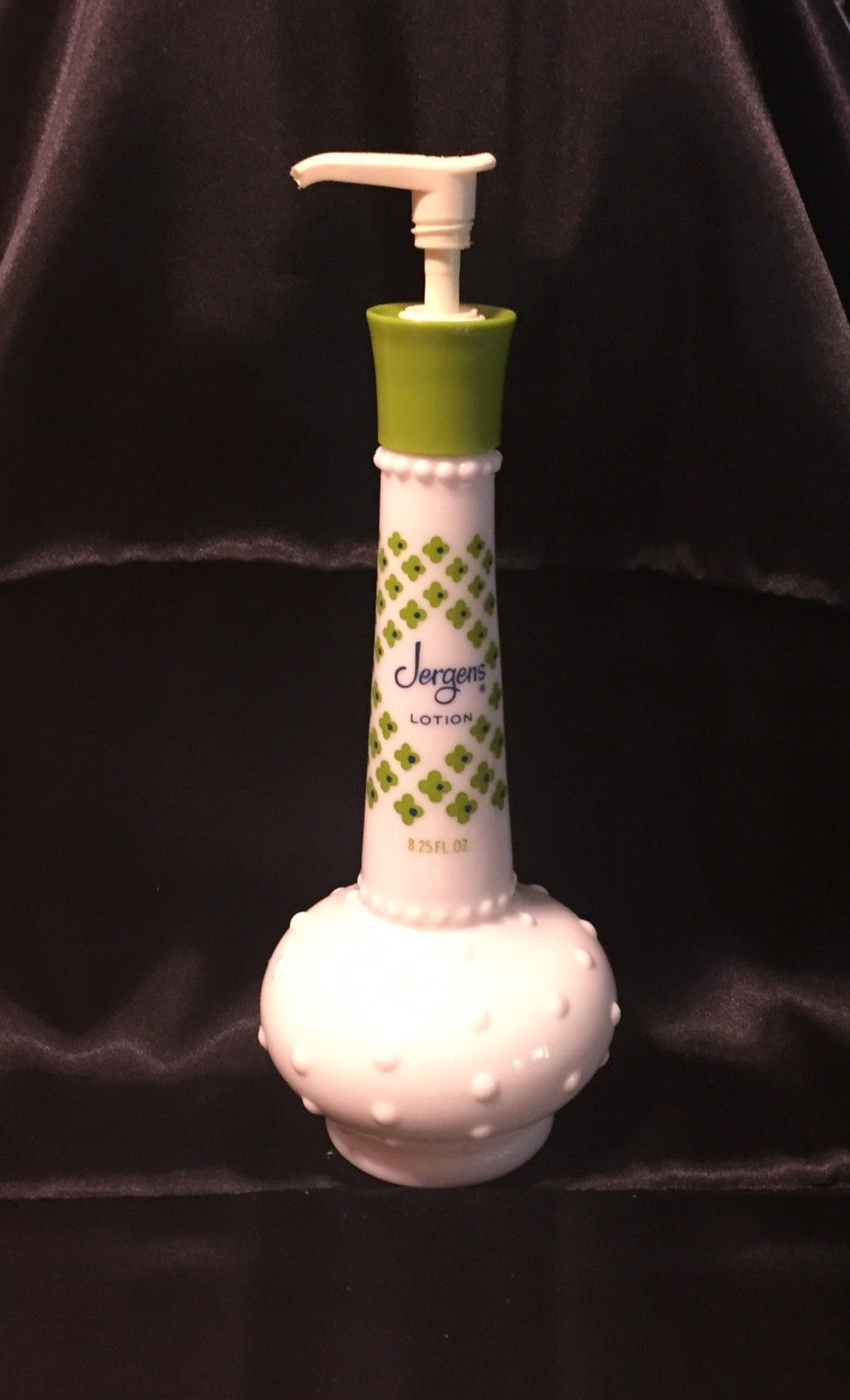 Title (ebay affiliate link): Vintage JERGENS Lotion White Hobnail Milk Glass Pump Bottle, Green & Blue Design