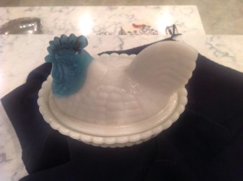 Title (ebay affiliate link): Vintage Milk Glass Milk Glass Rooster On Nest With Blue Head Covered Dish