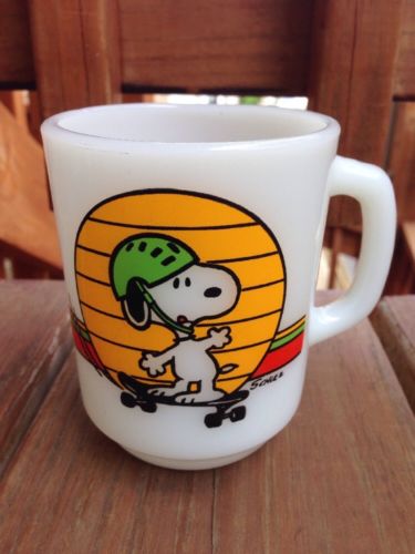 Title (ebay affiliate link): VINTAGE FIRE KING PEANUTS SNOOPY ON SKATEBOARD MILK GLASS COFFEE MUG