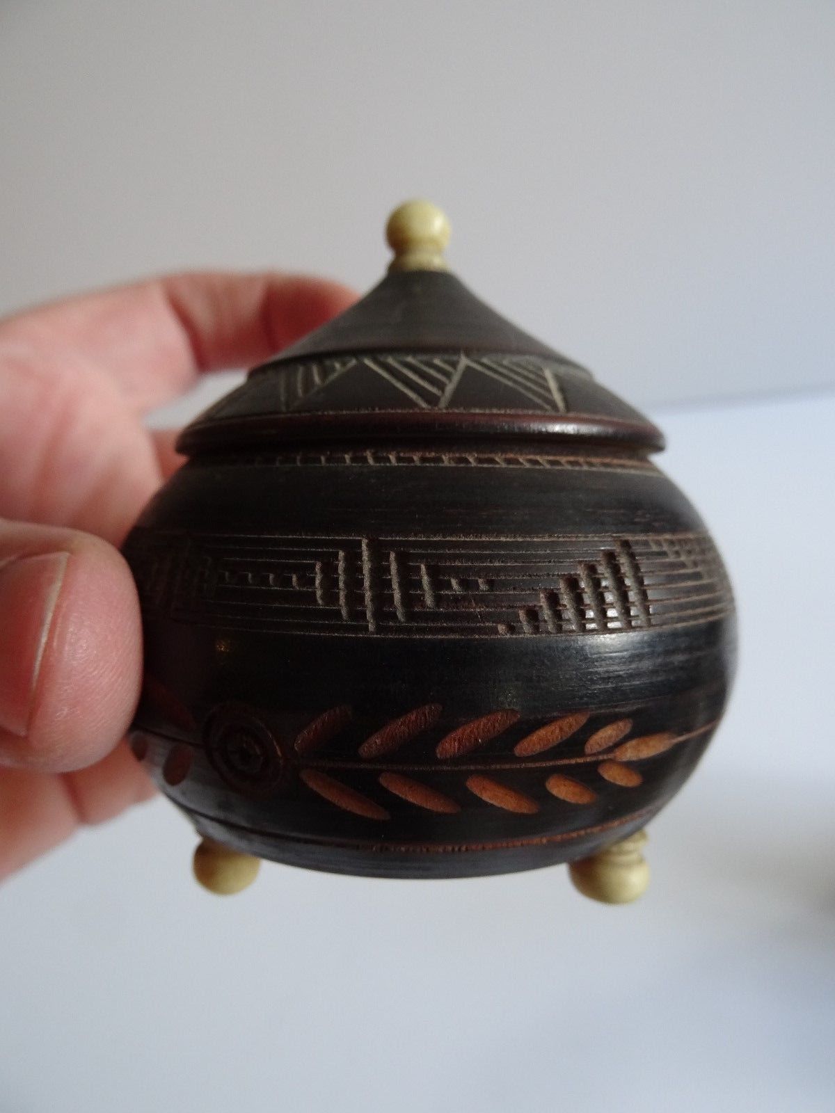 Title (ebay affiliate link): Vintage Wood Hand Carved Small Round Trinket Box with Lid Bowl Wooden Art Ware