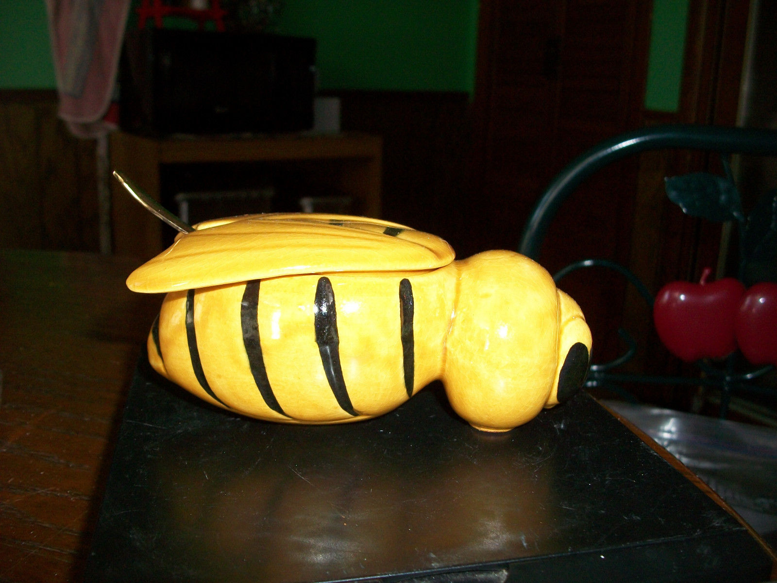 yellow jacket bumble bee shaped sugar bowl with lid & spoon
