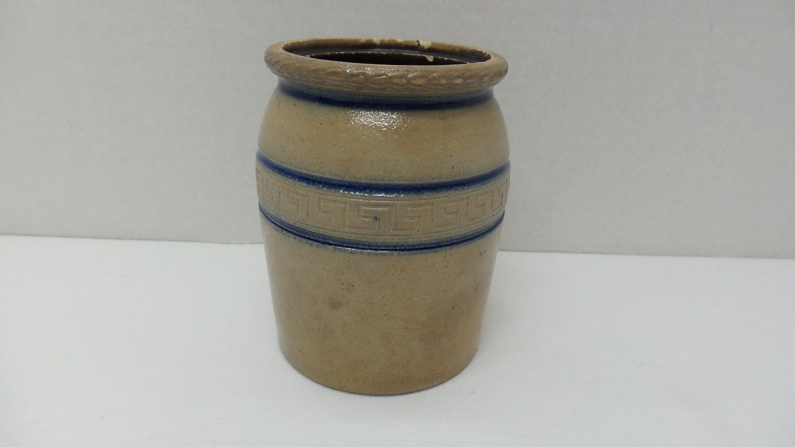 Title (ebay affiliate link): Antique Salt Glaze Stoneware Pottery Small Crock Jar Greek Key Blue Bands