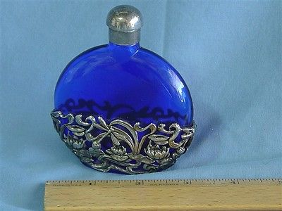 Title (ebay affiliate link): Beautiful Vintage Cobalt Blue Perfume Bottle Glass and Metal Secession Pattern