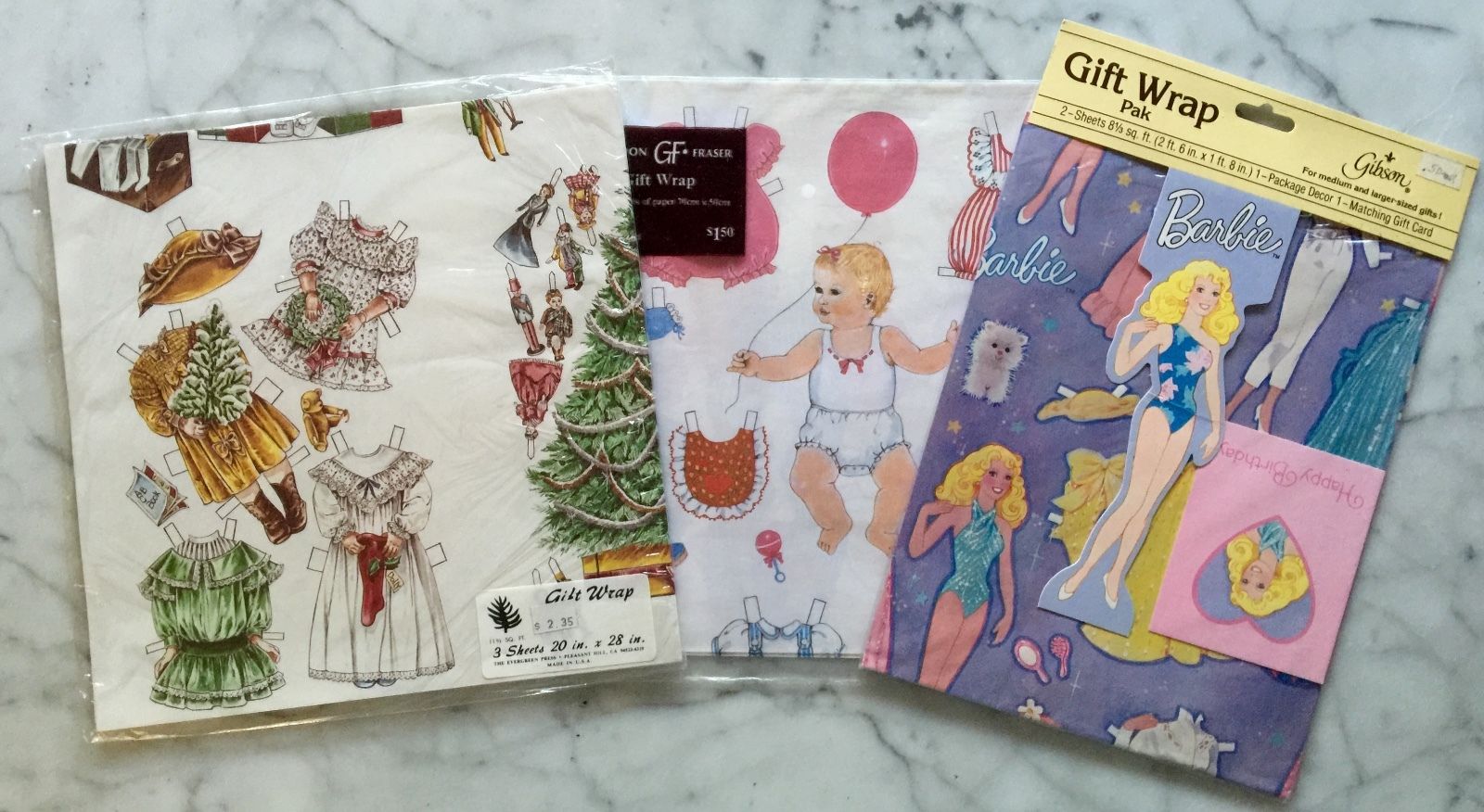 Title (ebay affiliate link): Lot 3 Vintage Doll Cut-Out Gift Wrap Paper New~Unopened
