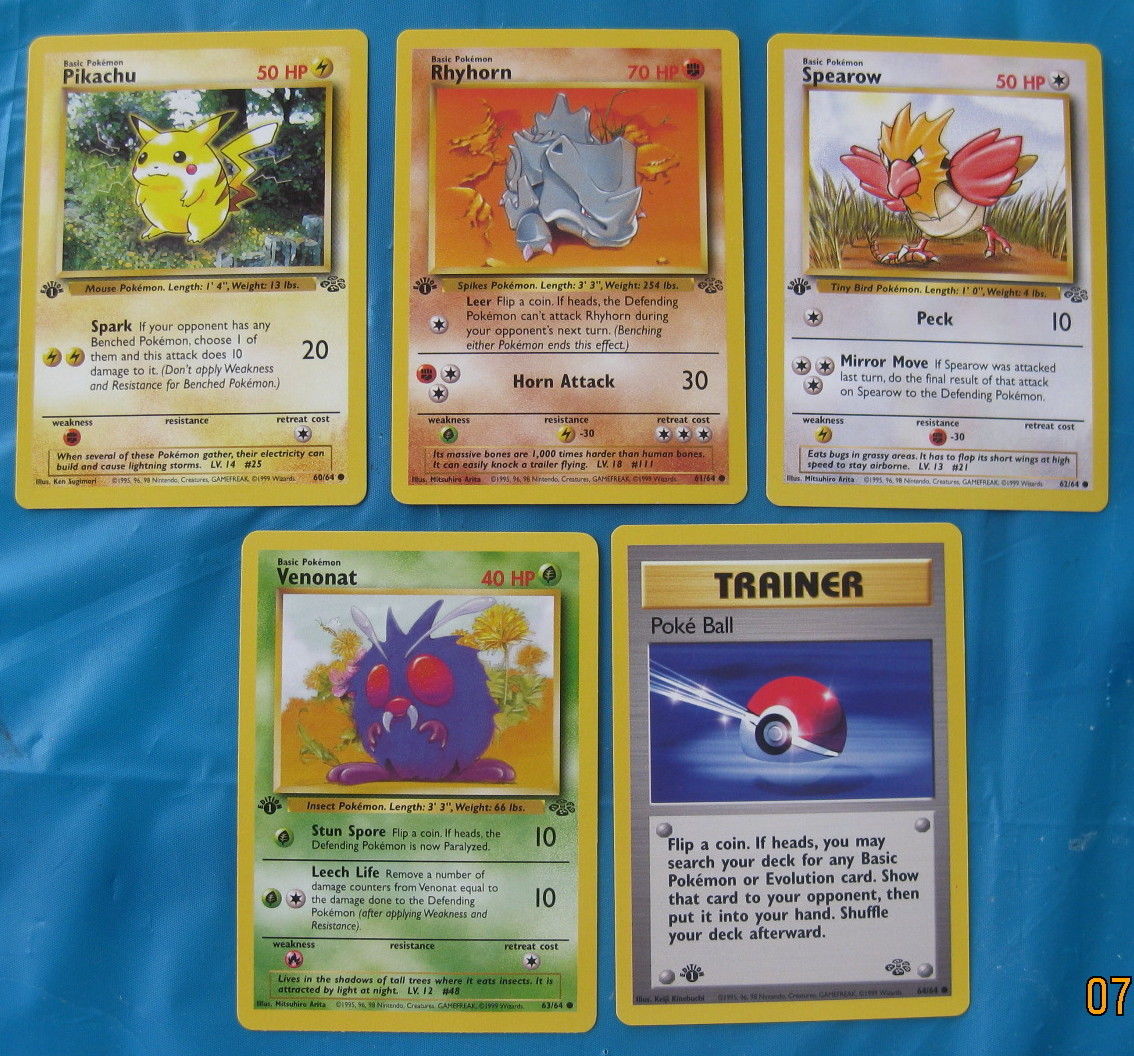 Title (ebay affiliate link): Pokemon 1st Edition Jungle Trading Card Mix, #'s 60-64 (#64 is trainer) of 64