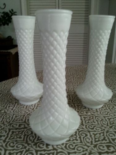 Title (ebay affiliate link): 3 Vtg Randall White Milk Glass Bud Vase Diamond Quilt, Party,Wedding Shower