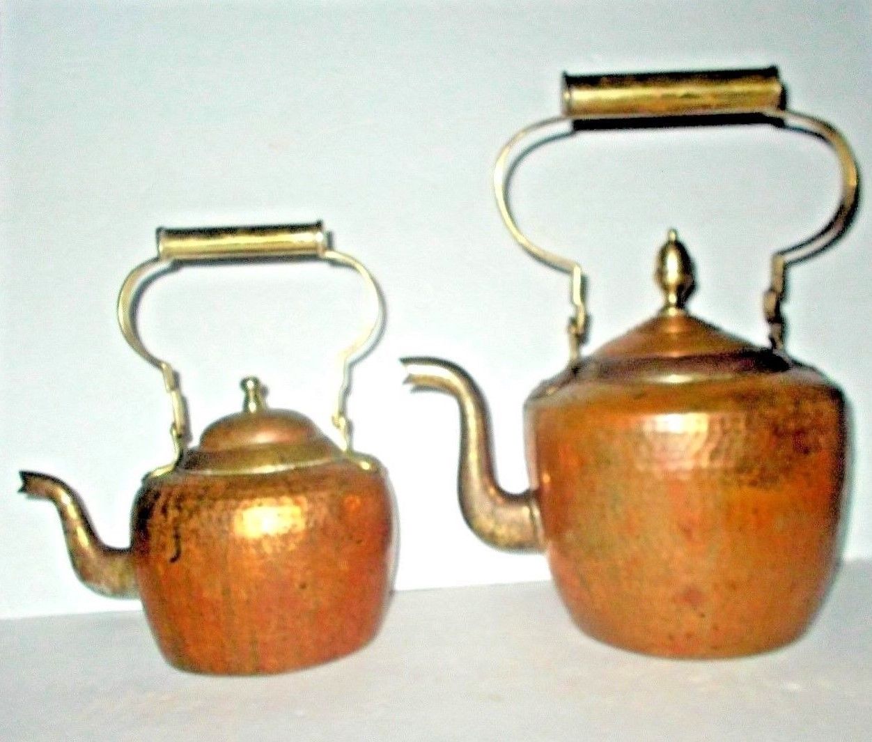 Title (ebay affiliate link): ANTIQUE COPPER & BRASS KETTLES 2 HAMMERED COPPER KETTLES w/BRASS HANDLES