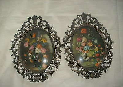 Set 2 Vintage Convex Bubble Glass Metal Scroll Frame Floral Pictures Italy VGC