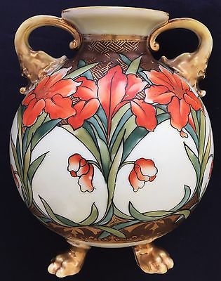 2 Old Nippon Hand Painted Vases Flowers Elephant Head handles Lion Feet Green mk