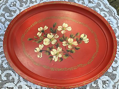 Red Metal Nash Company Tray with Hand Painted Flowers