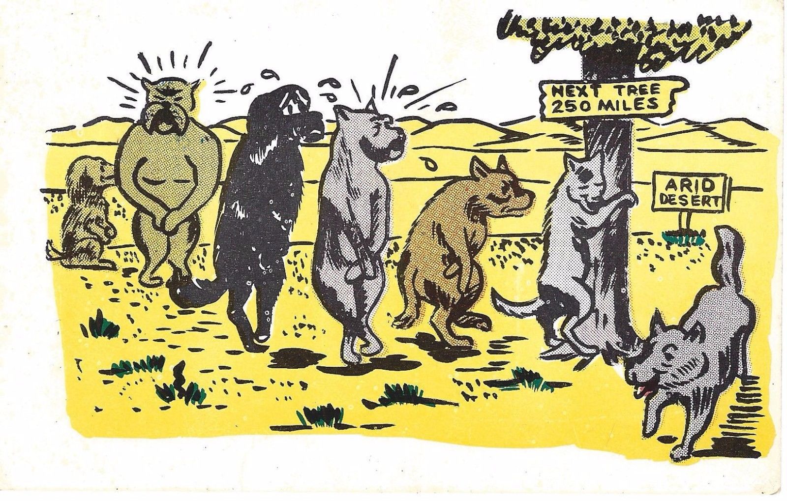 Title (ebay affiliate link): 1961 Dogs In Line Restroom Rest Stop Bathroom Tree Desert Cartoon Humor Postcard