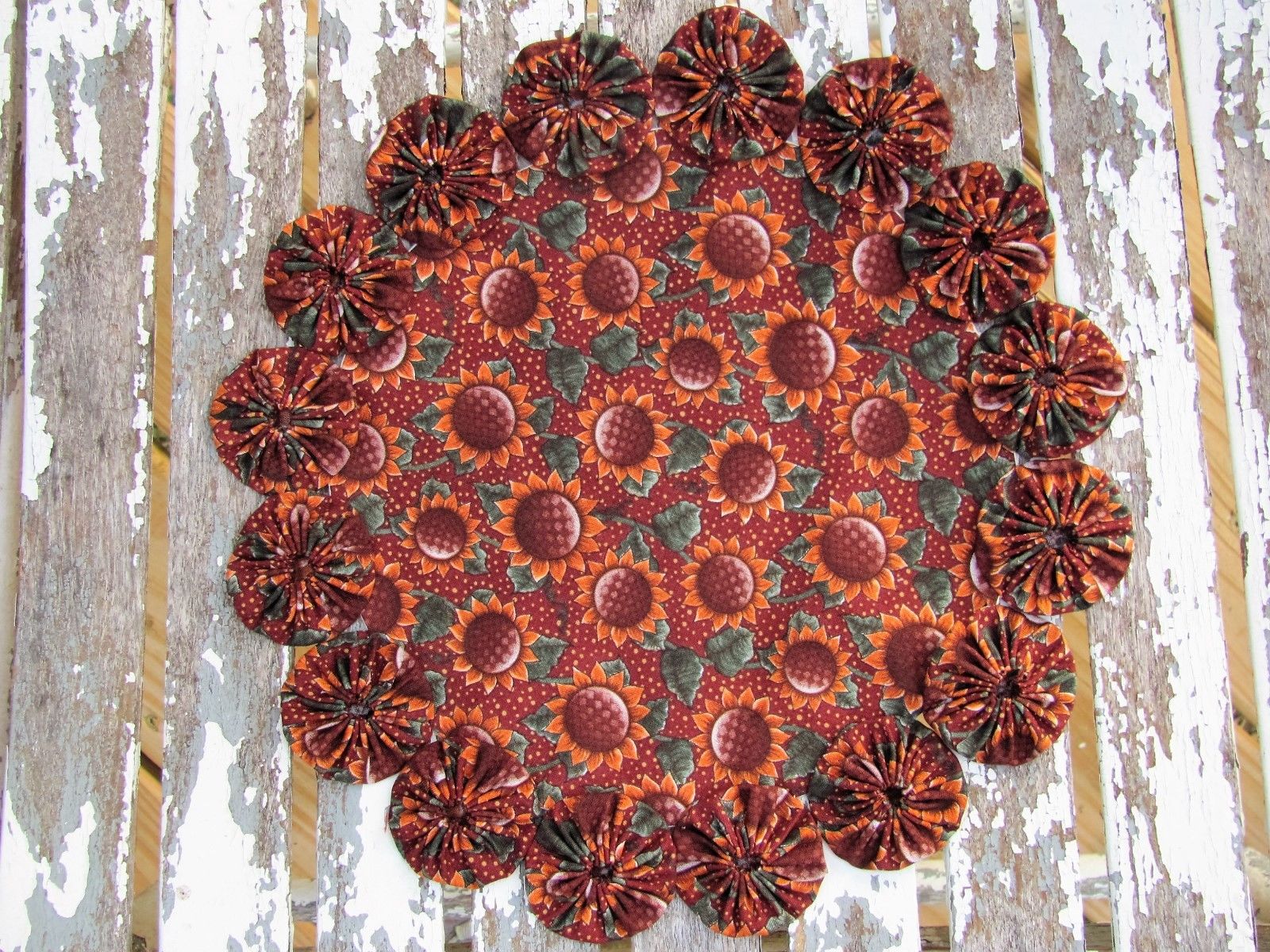 Title (ebay affiliate link): Folk Art Sunflower Fall Decoration Quilting Yo Yo Candle Mat Doily Table Topper