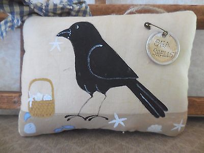 Primitive Folk Art Summer Beach Fun Pillow Tuck Seashell Collector Crow at Beach